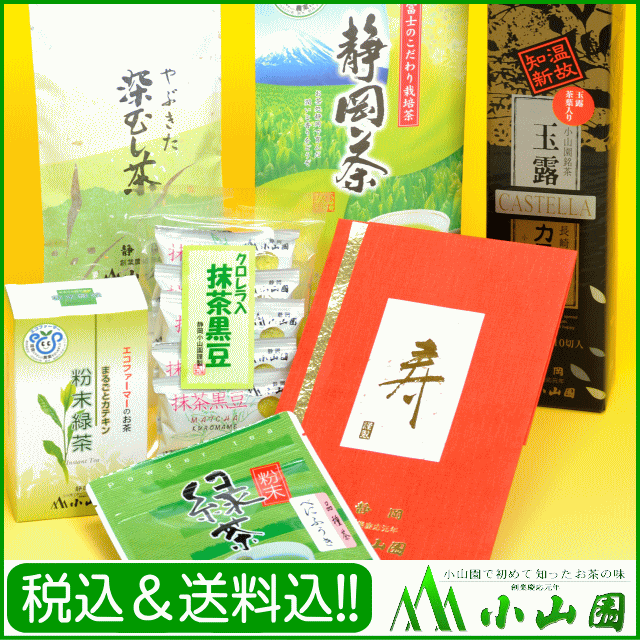 ・年賀茶「寿」50g袋入 1,050円(税込)・深むし茶 100g袋入 630円(税込)・エコ富士のこだわり栽培茶 50g袋入 630円(税込)・エコファーマーの粉末緑茶 15本 箱入 420円(税込)・品種茶「べにふうき」40g袋入 840円(税込)・玉露カステラ 280g箱入 1,050円(税込)・抹茶黒豆 5袋入 210円(税込)・梱包代・送料 450円(税込)以上、合計5,280円(税込)のところ、送料込み特別価格2,980円(税込)にてお届け致します!